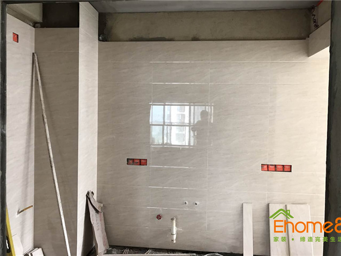 墻磚鋪貼,使用水平儀投射水平線,陽角處采用磨邊45°碰角工藝。